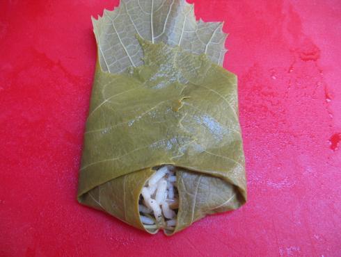 - Listy po jednom položíme na prkénko stranou se žebry nahoru a lžičkou položíme náplň na stranu odříznuté stopky, přeložíme ze stran a zavineme (viz obrázek).